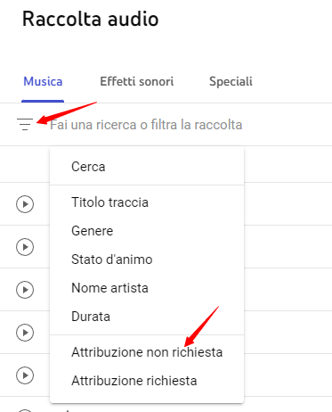 E cliccare poi su Attribuzione non richiesta. In questo modo l’algoritmo ti mostrerà solamente i brani e canzoni che saranno copyright free, e cioè gratis da utilizzare come e quando vuoi senza l’obbligo di citare l’autore all’interno delle tue creazioni.