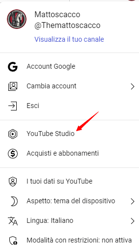 Cliccando sul tuo volto (o sulla tua immagine o sulla lettera) che trovi in alto a destra, ti compariranno una serie di opzioni. Fra queste avrai la possibilità di cliccare su YouTube Studio proprio come mostrato nell’immagine che trovi qui accanto.